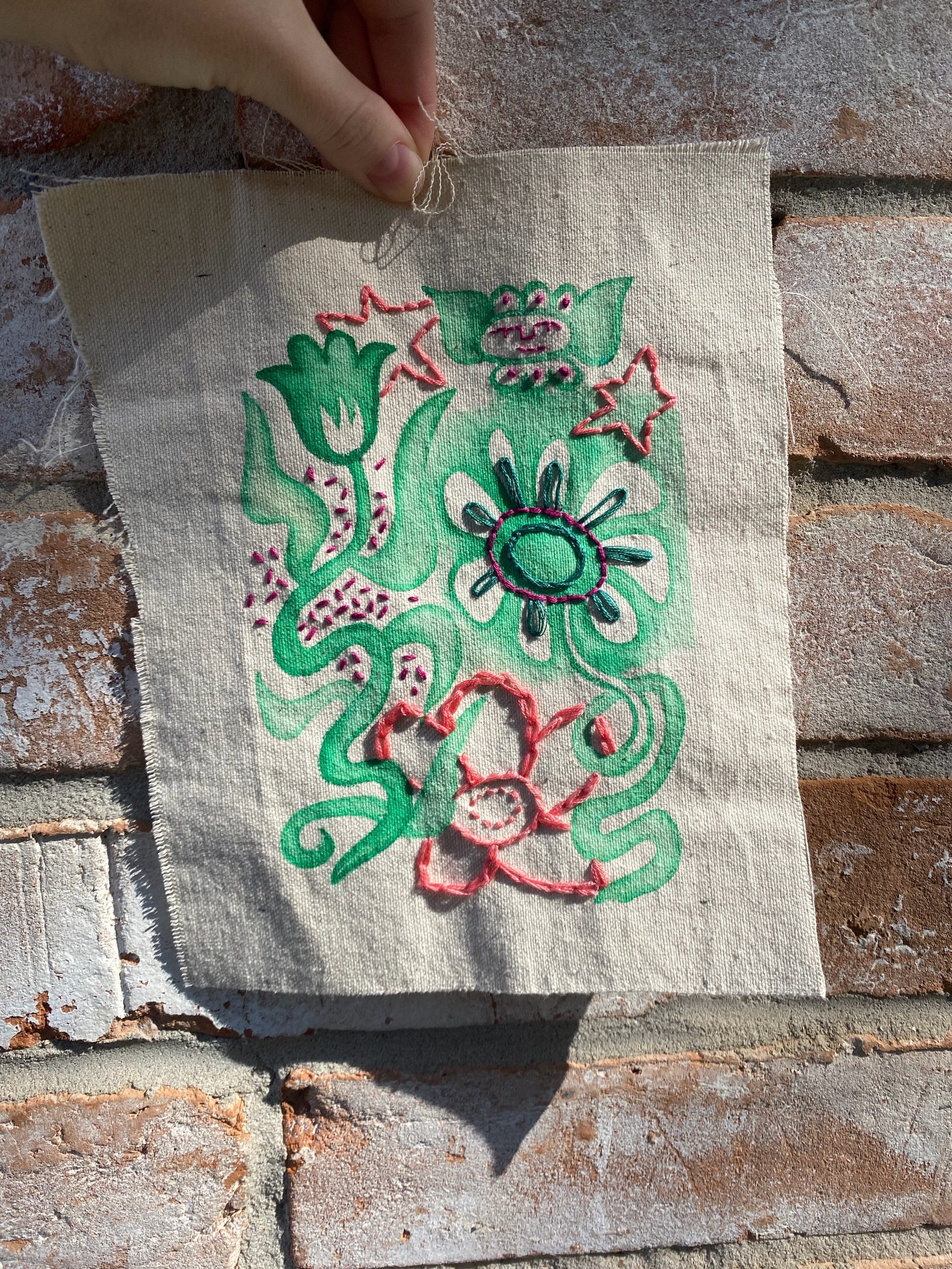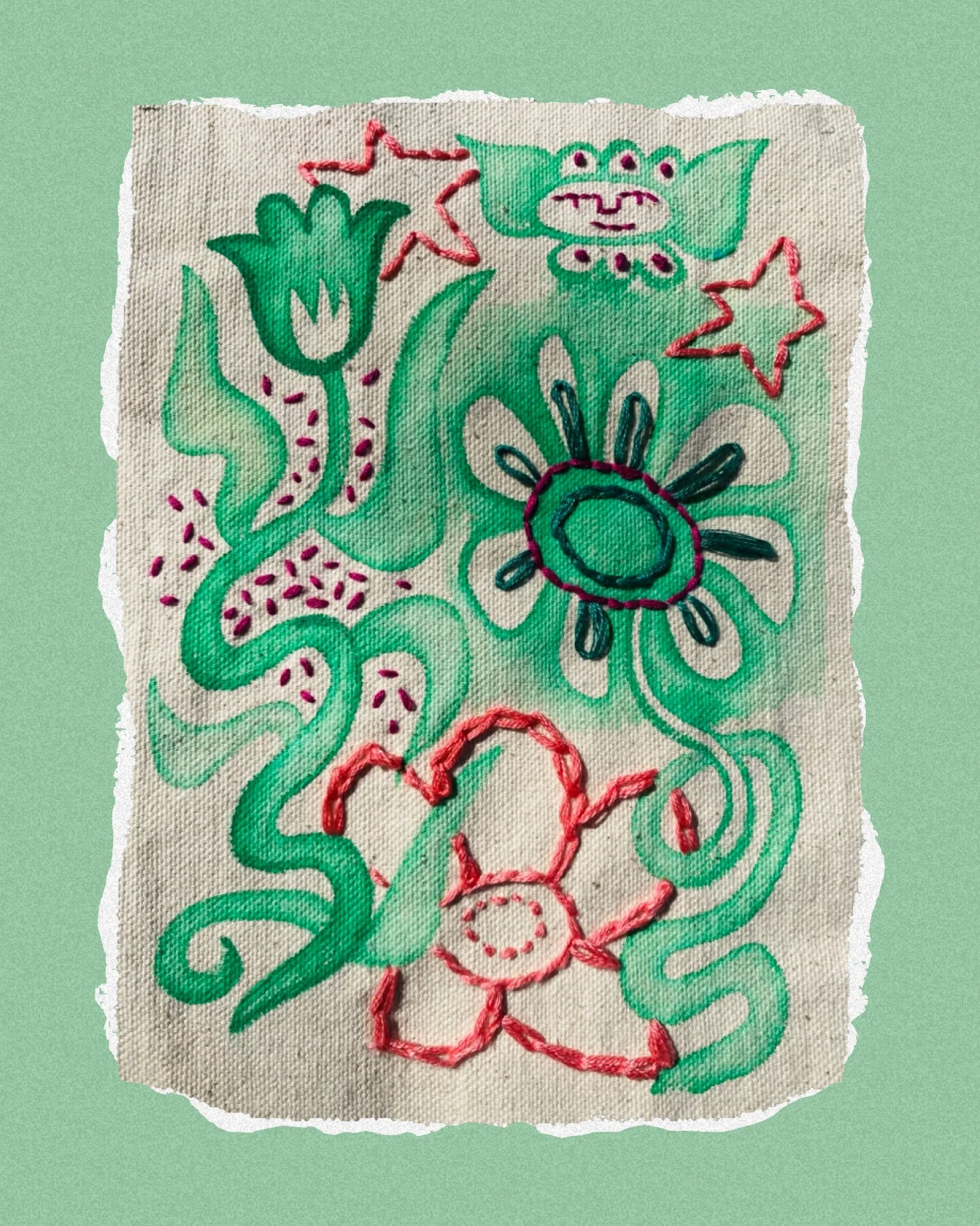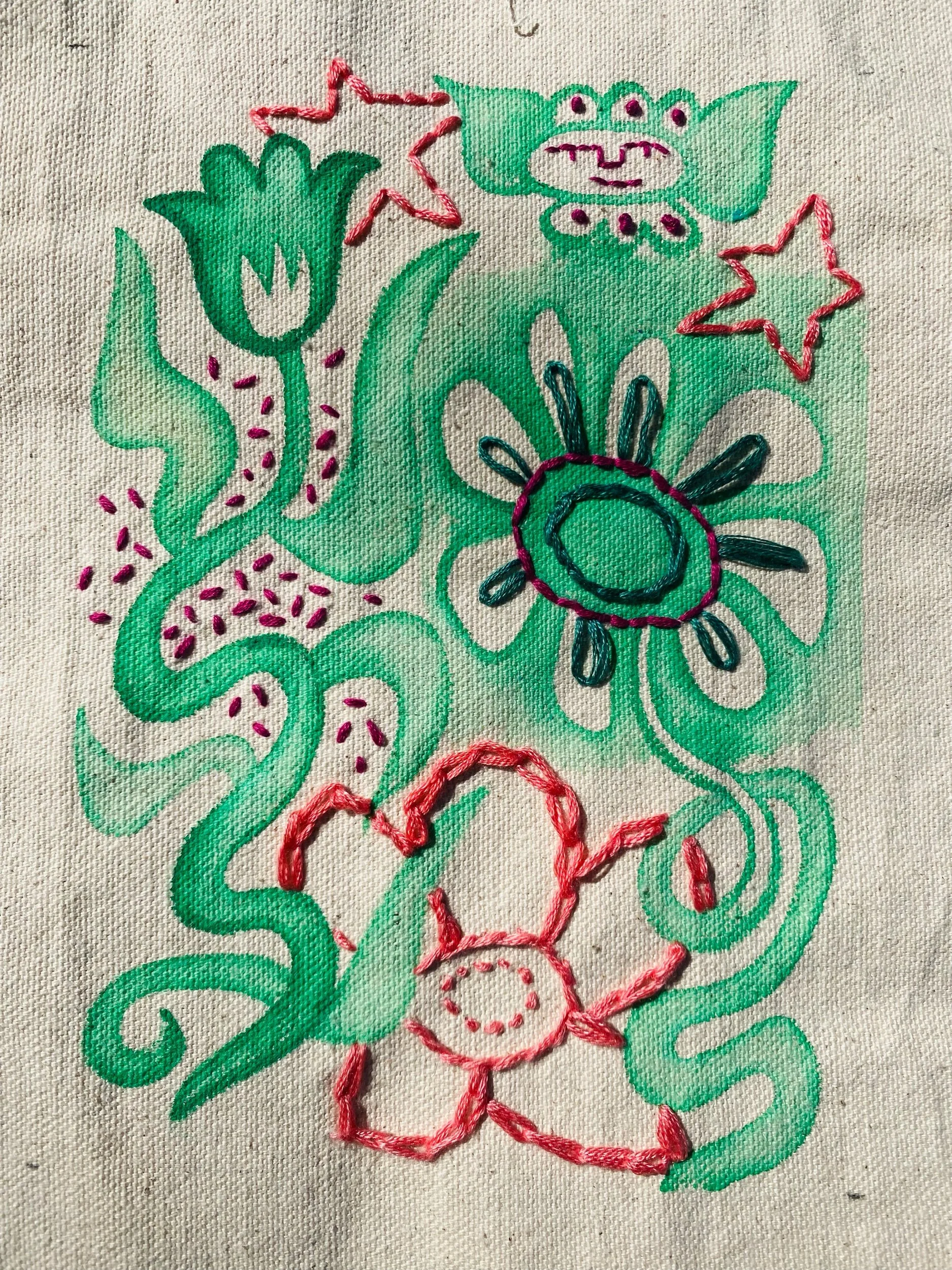 Hand-painted on raw canvas and embellished with embroidery. Created between dreams, my daughters’ nap times and house chores.